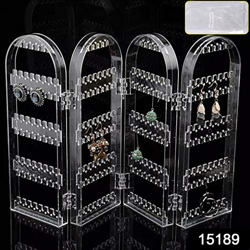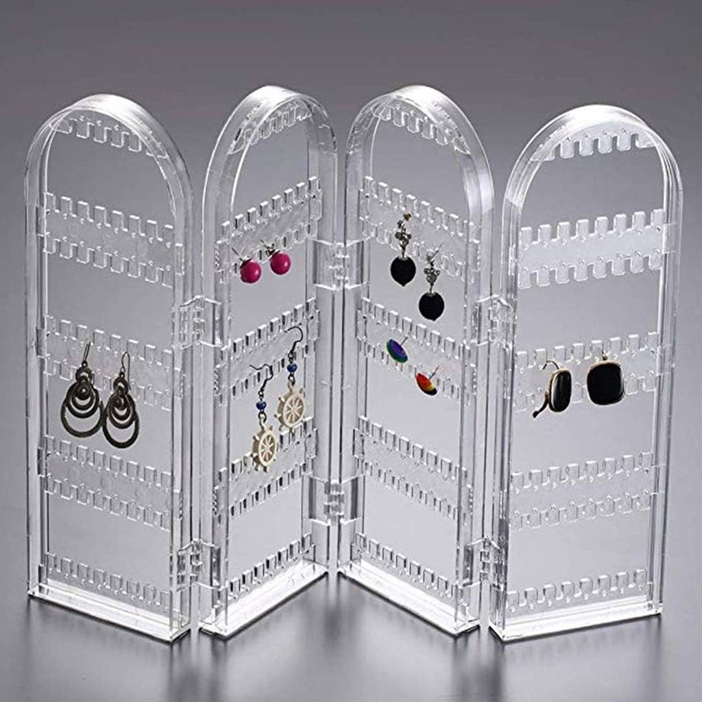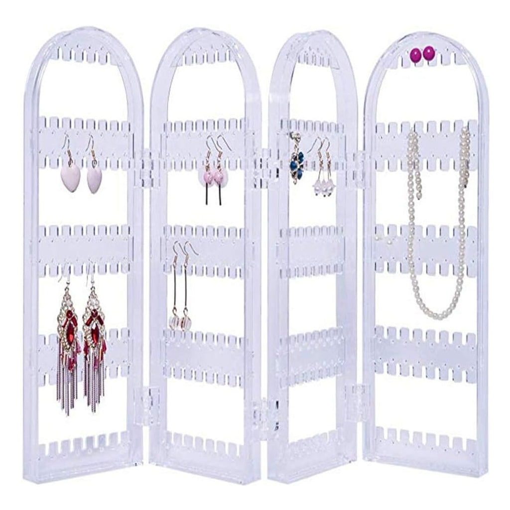 earring holder , jewelry organizer , earring storage stand , hanging earring display , jewelry display rack , makeup vanity accessory , closet storage for earrings , gift for girls and women , transparent earring stand , portable jewelry holder , 4-panel display stand